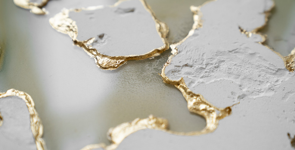 Running alongside this is the influence of Kintsugi, the Japanese philosophy of golden repair. Rather than obscuring damage, the method renders fracture visible—veins of gold transforming brokenness into strength. “I wasn’t interested in covering anything up,” says Rose. “I wanted to make the gold the thread that holds it together.”